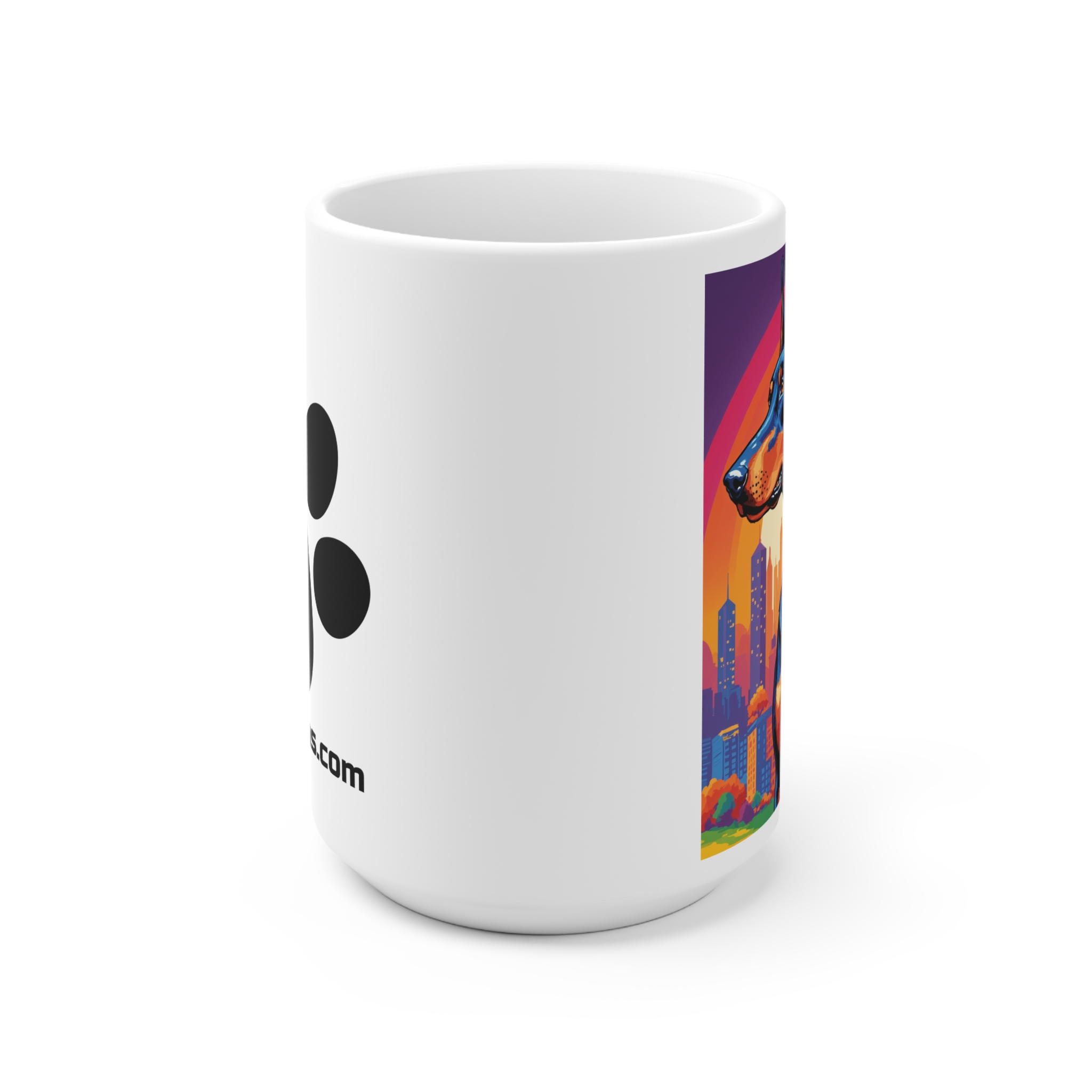 Bright and bold, this Doberman Pop Art city ceramic mug brings alleyways and neon nights to your morning coffee. Colorful pop-art panels wrap all the way around the white ceramic body, catching light and attention from every angle. The large C-handle feels steady in your hand as you cradle a warm brew, and the rounded corners give it a softer, modern silhouette. Built for everyday use—dishwasher and microwave safe—this cup keeps its vivid colors while standing up to routine. It reads like a little urban story on your counter: a loyal Doberman silhouette against city shapes and splashes of saturated color, the kind of cup that sparks a smile between sips and fits right into mornings, late-night study sessions, and slow weekends at home.