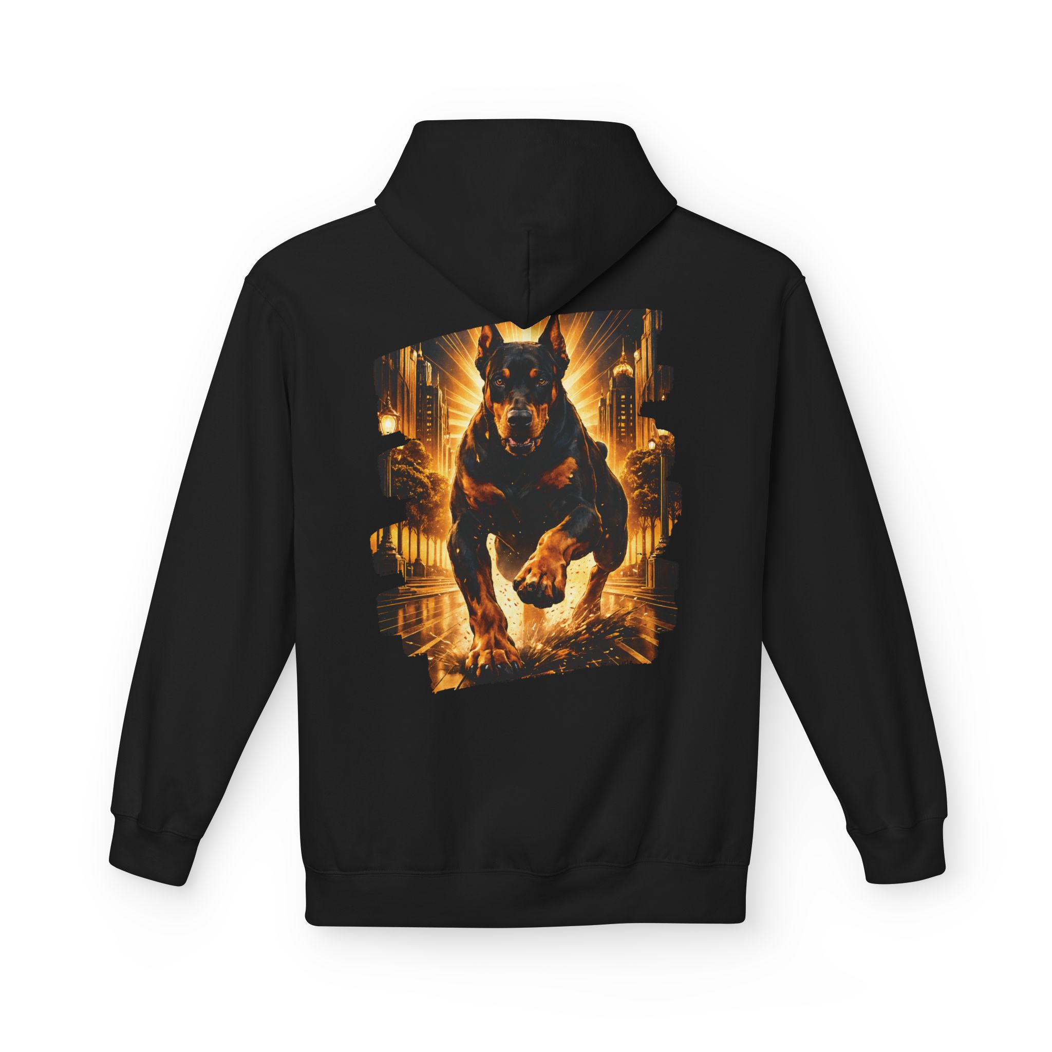 Doberman Protector Gold Charging Hoodie — Urban Guardian Fleece Unisex for women and men
