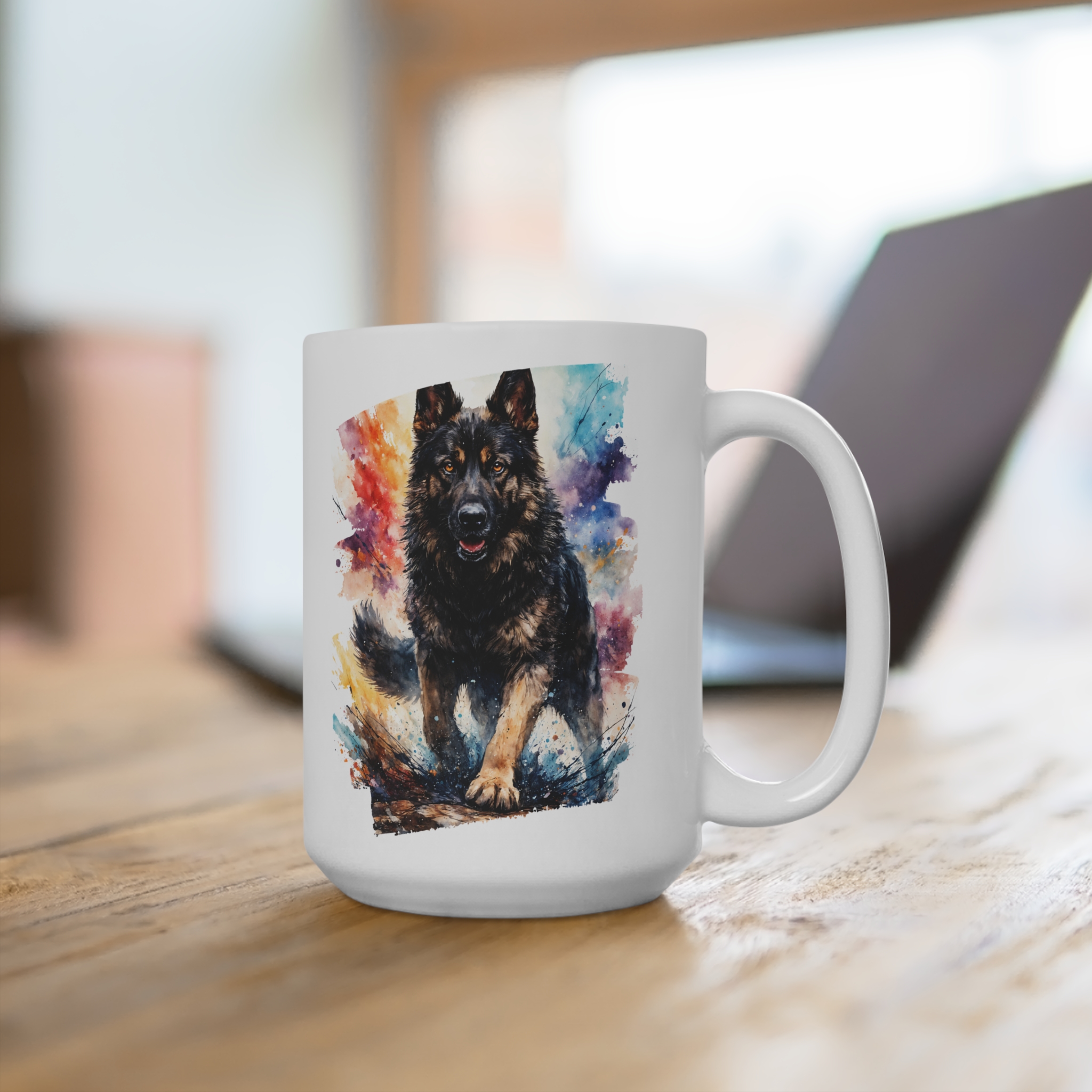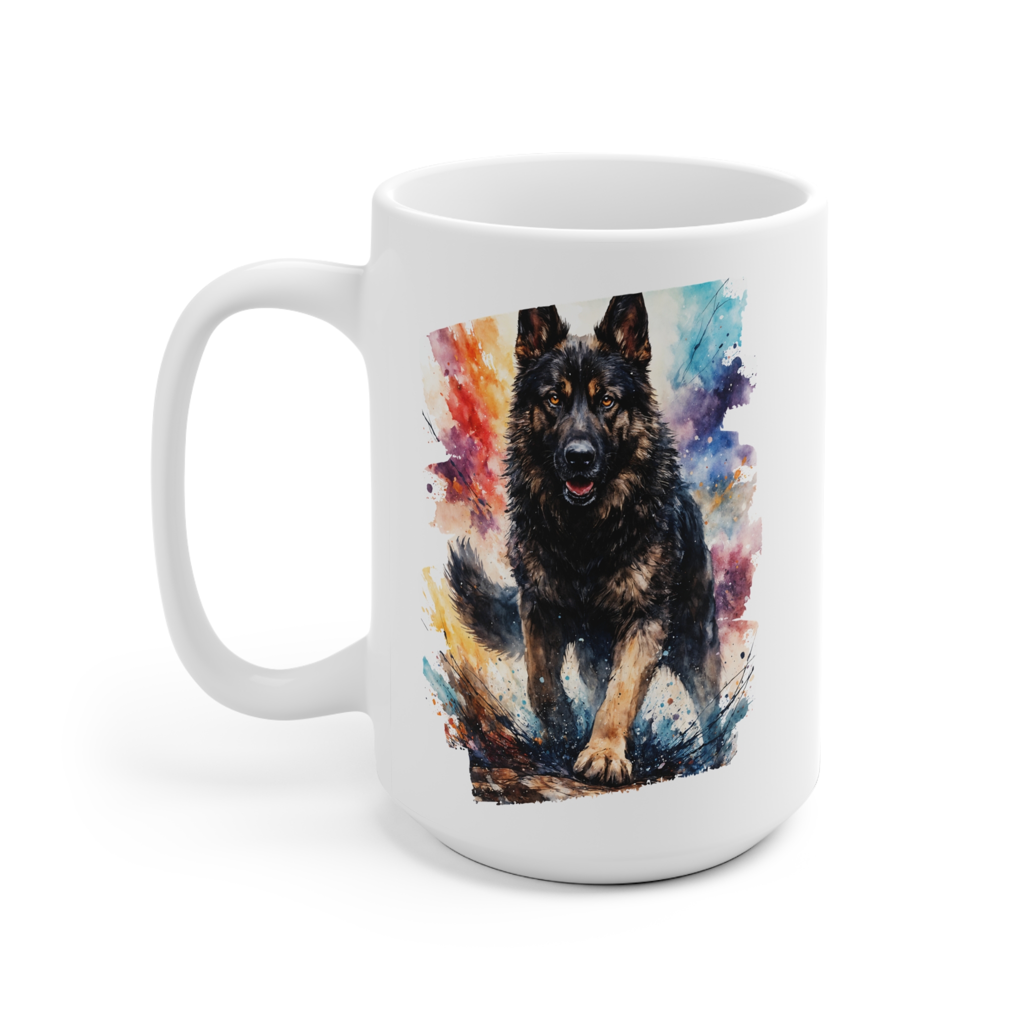 Morning light warms porcelain and a splash of color brings a wagging heart to the table. This ceramic mug features a bold, painterly German Shepherd design that reads like a small portrait — vivid hues wrap the cup so the image follows you with every sip.