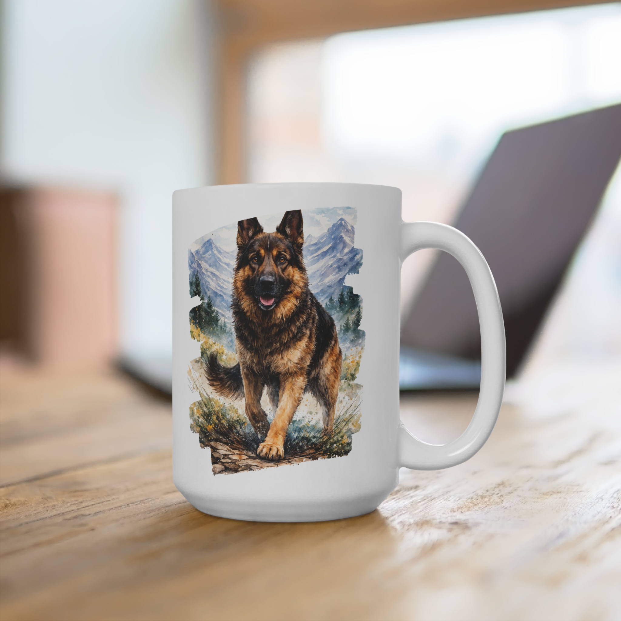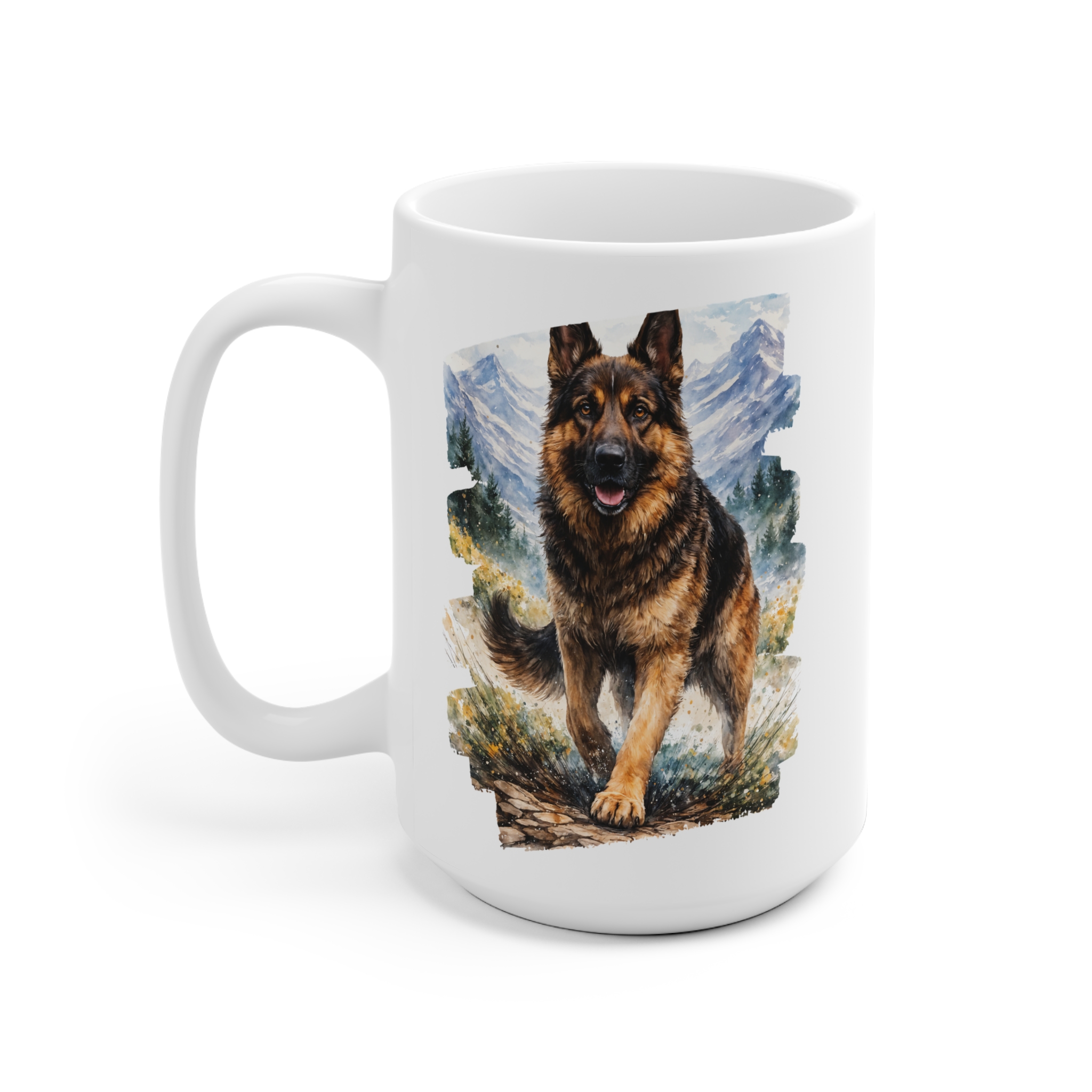 Early morning on a mountain trail: crisp air, pine-scented breath, and a loyal German Shepherd at your side, watching the sunrise spill color across the ridgeline. This ceramic mug brings that scene to your kitchen—bold, vivid artwork wraps around the cup so the dog and landscape are alive from every angle. It’s built for everyday rhythm: comfortable C-handle for steady sips, dishwasher and microwave safe for busy mornings, and available in two sizes to match how you take your coffee or tea. REACH certified and finished in bright, durable colors, this mug feels right at home in cabins, camper vans, or a city apartment where weekend hikes are planned between work calls. Hold it, and you’ll remember the pull of the trail and the steady companionship of a four-legged friend.