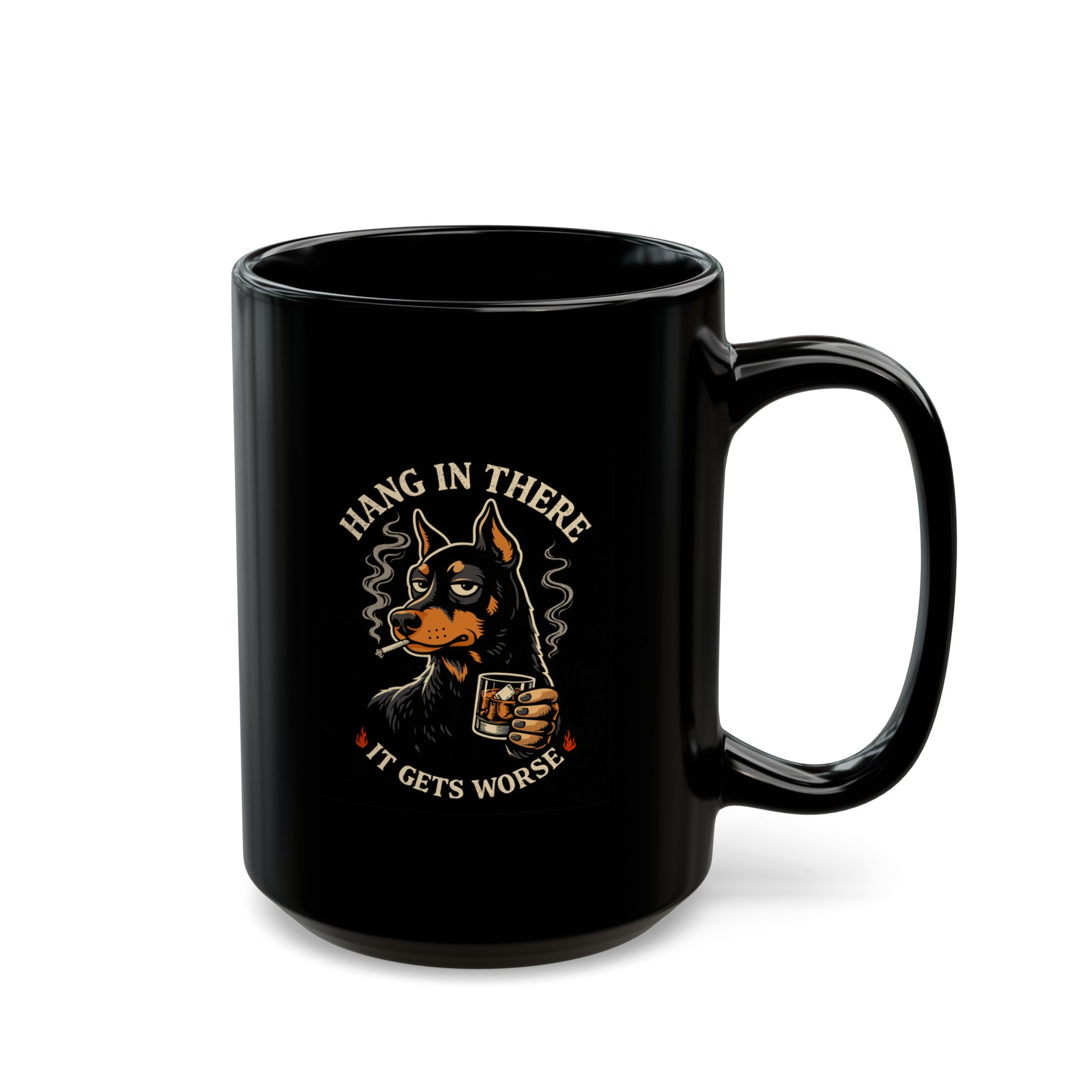 Hang In There It Gets Worse Mug — Funny Doberman Coffee Cup Black
